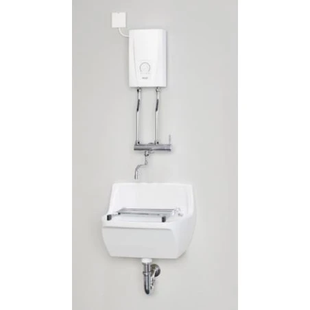 - Ensemble composé d’un chauffe-eau instantané à commande électronique en format compact en tant qu’unité de sur-refoulement et d’un dispositif de sur-refoulement sans pression à un levier clavier avec affichage LED pour l’entrée de la température au degré entre 20°C et 60°C