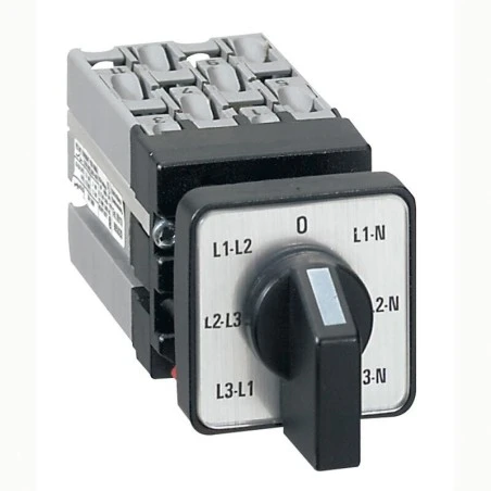 - Manette – Voltmètre – 1 réseau triphasé, 1 voltmètre – Gamme mini-com – Valeur maximum en AC21 : 10A – 6 contacts à ouverture positive et double coupure des pôles – Avec neutre